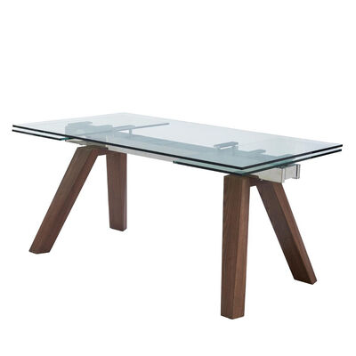 The dining table is accentuated by its special wooden leg design, which adds warmth and natural charm to the overall aesthetic. The wooden legs are carefully crafted with attention to detail, showcasing the unique grain patterns and textures of the wood. This combination of glass and wood creates a visually striking contrast, making the dining table a focal point in your living space.